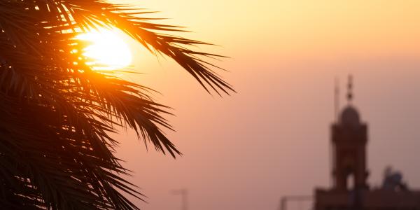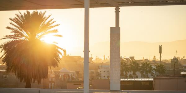 At dawn, the city glows in warm red light, with the Atlas Mountains silhouetted in the distance.