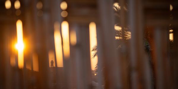 Rooftop views reveal a magical contrast — terracotta rooftops against the soft pastel sky.